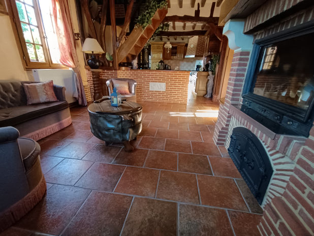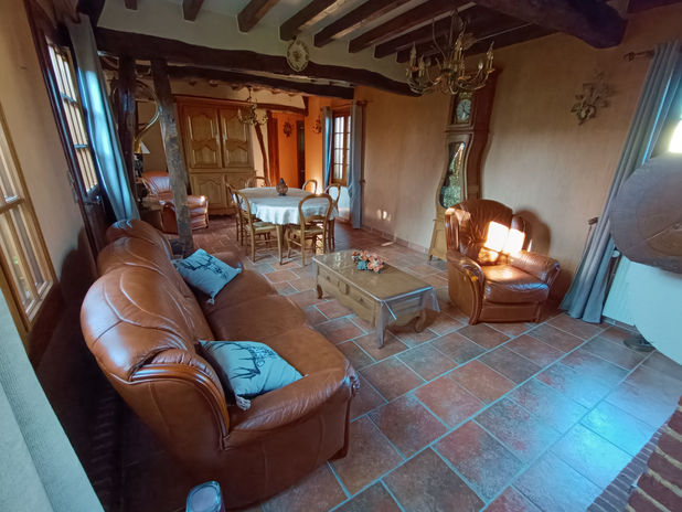 Grande salle/salon (double-séjour) avec poutres apparentes et cheminée insert, idéal pour les soirées cocooning